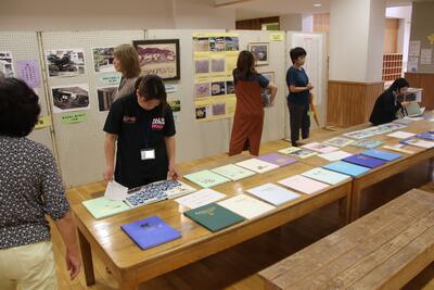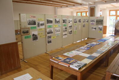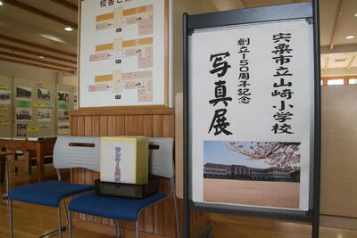 山崎小学校の150年をふりかえる「写真展」の準備ができました。テーブルの上には卒業アルバムも展示しています。ぜひ、ご覧ください。