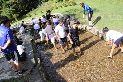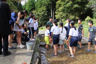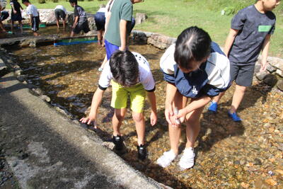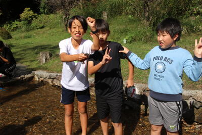 あまごつかみに挑戦しました。全員あまごにさわることができました。暑くなく爽やかな秋風が気持ちいいです。