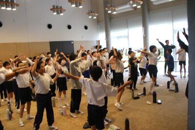 朝の集いでたいそうしてます。
