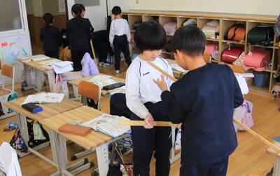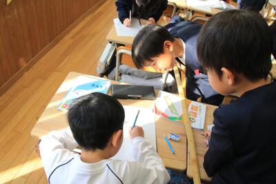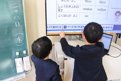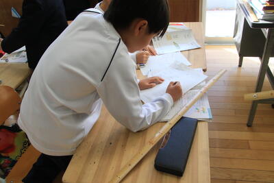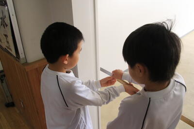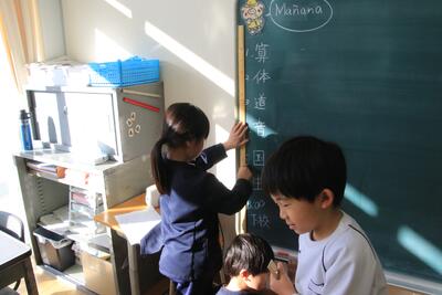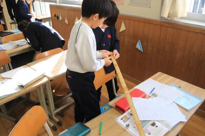 2年生が算数で「長さしらべ」をしています。1m定規をつかって、長さをよそうしてはかっていました。