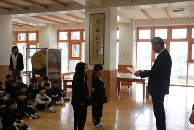 子どもの詩と絵の表彰を行いました。絵で1年生「おまつりたのしいな」2年生「ちきゅうのたまご」が入選に選ばれました。